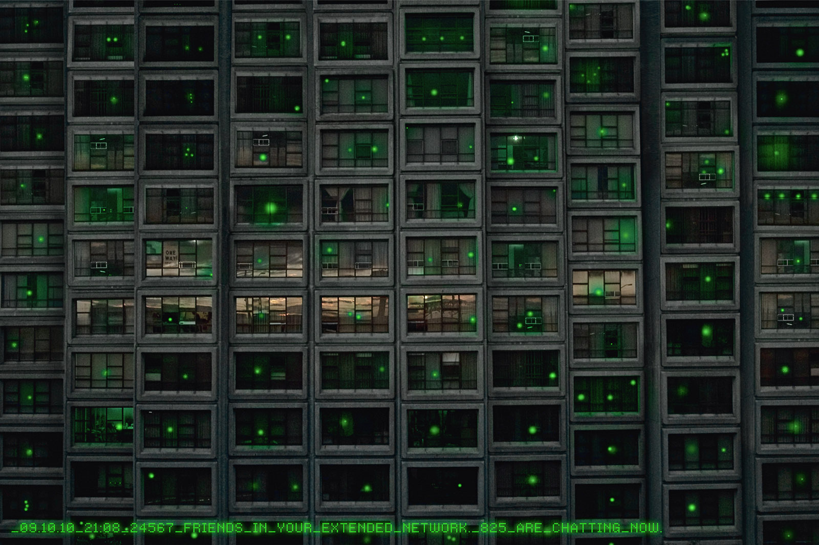 2080: More and more Messengers users and addicts choose to live in the Network and returning to real life, which means violence, hunger and suffering, becomes increasingly difficult. The Messengers now form a sectarian community waiting for the coming of the “New Kingdom”, a transubstantiation of the cyber world finally incarnated and fulfilled. Most of the Insiders become full-time Messengers and do not return from the Network to feed their body. Cities now become huge mass graves overcrowded with infectious corpses. Victims of technology exclusion, denoted as "OUTSIDERS", run away from theses deadly sources of epidemics, seeking asylum in outer human-free spaces, but most of them die from thirst, hunger, exhaustion or contamination. Thanks to the energy and the computing system provided by the machines, the Messengers go on evolving, but their independent and unstoppable evolution towards a collective consciousness make the communication with the Machines increasingly difficult because they do not recognize the Messengers as their ancestors or as a human master intelligence anymore. Pollution in the air is so deadly high that most shades of the colour spectrum are not visible anymore.